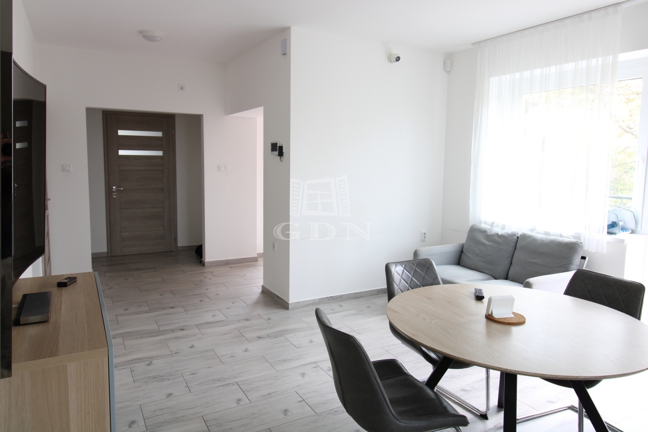 Földszintre egy 3,88nm-es szélfogón keresztül juthatunk be. Ezen a szinten 21,5nm nagyságú amerikai konyhás nappali, valamint az ehhez tartozó 3,98nm-es kamra, 24,3nm terjedelmű hatalmas világos szoba, (jelenleg ez a helység kettő egyenként 12 és 9nm-es szobára lett átalakítva) 7,9nm-es fürdőszoba, 1,6nm-es külön helyiségben kialakított WC és kézmosó, 4,4nm-es közlekedő, valamint 8nm nagyságú lépcsőház lett kialakítva. Ebből a lépcsőházból juthatunk le a szuterén részbe, illetve a felső szintre.