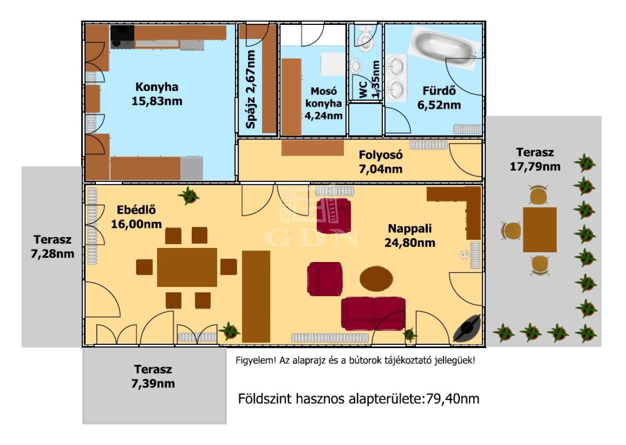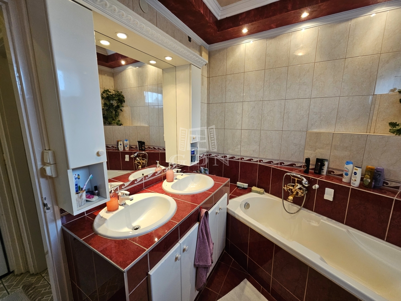 A konyha világos, elegáns kivitelű, praktikusan elrendezett, teljesen gépesített, az étkezővel átadó pulttal is össze van kötve. Az étkezőrész és a nappali tágas, a rajta található tolóajtón keresztül a nagy teraszra is ki lehet ülni.